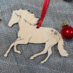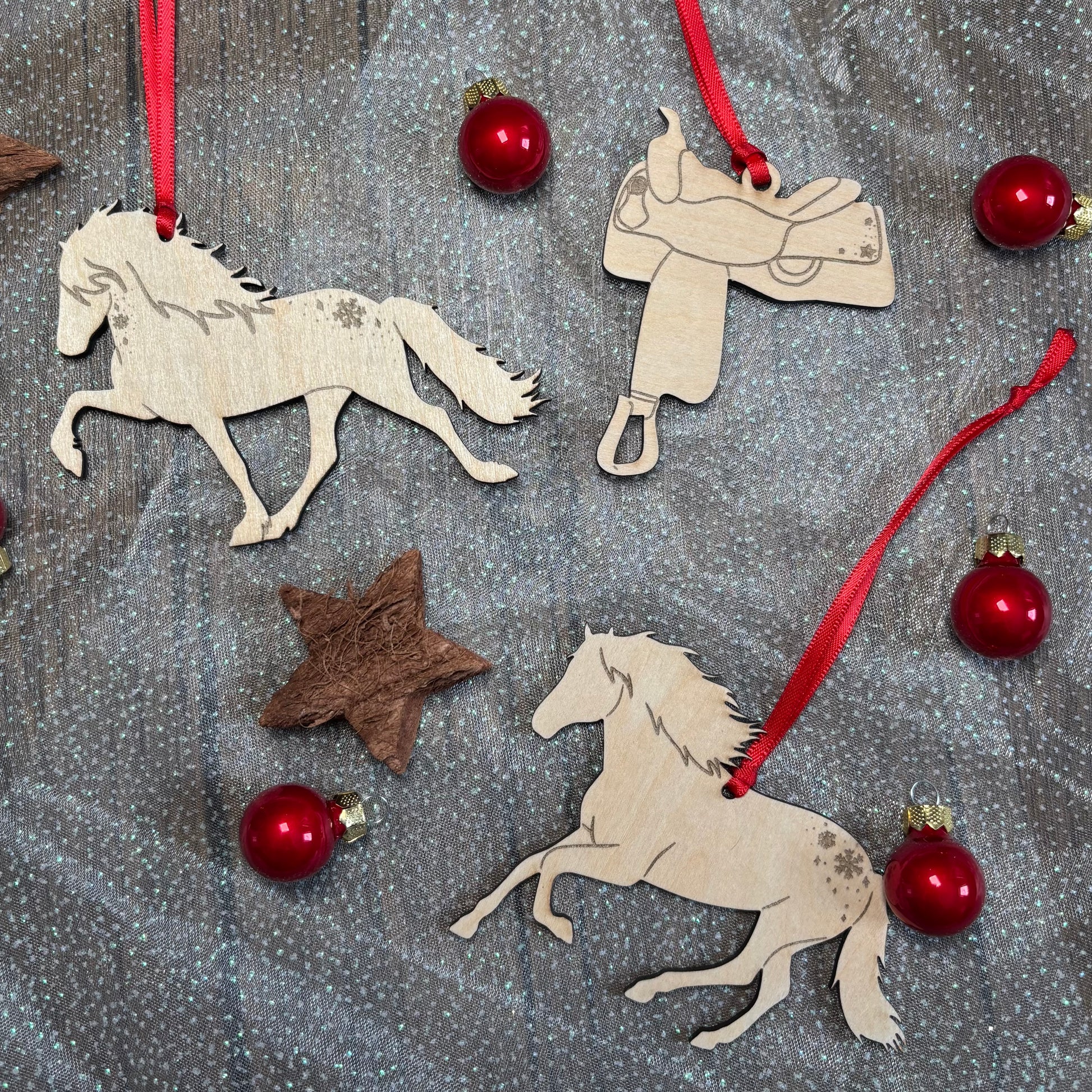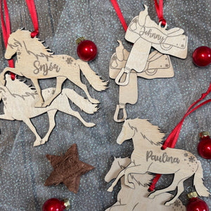 Einzigartiger Weihnachtsbaumschmuck aus Lindensperrholz in ca. 8cm Höhe mit rotem Band.